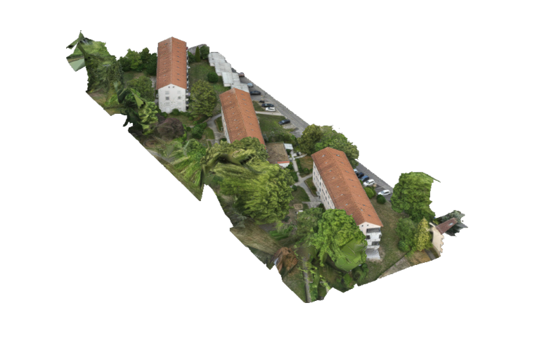 Drei Mehrfamilienhäuser in einem Modell zusammengefasst. Hier ist es möglich, die Gebäude innerhalb eines Modells zu betrachten, zu inspizieren und zu vermessen. Neben diesem online verfügbaren Modell erhält der Auftraggeber außerdem entsprechende 3D-Modelle (OBJ, FBX, GLB…) zur Integration in seine Software-Applikation um beispielsweise für seine Kunden die PV-Anlagen zu planen.